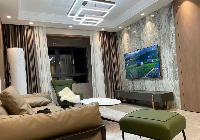 电视背景墙采用灰白色调整体大理石,有质感,同时高端大气