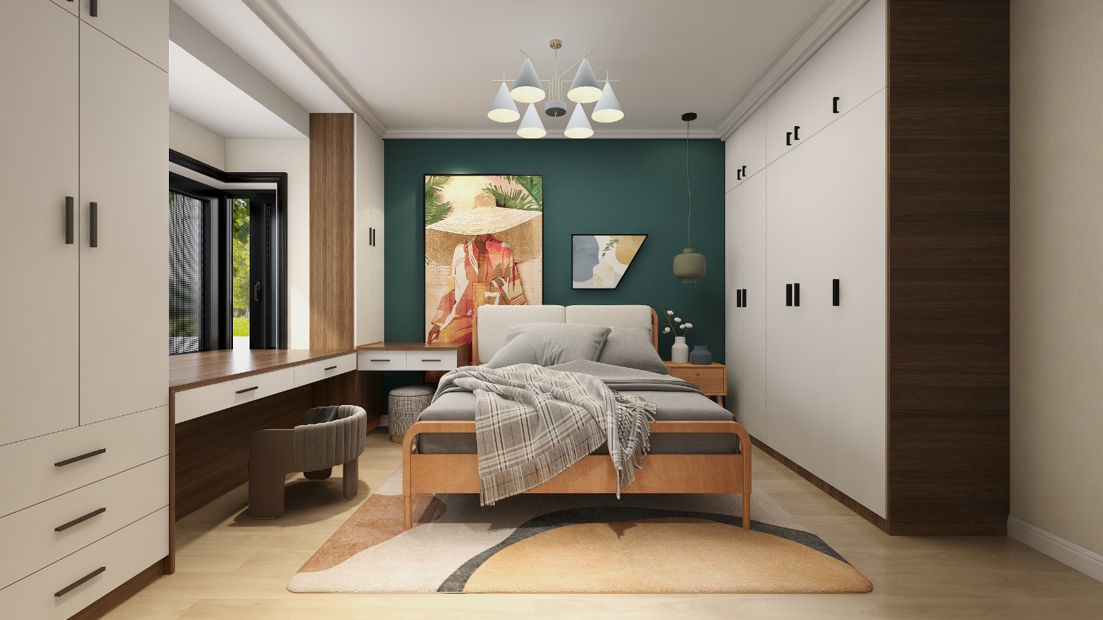 床头背景运用了一个孔雀兰色 凸显主人的个性