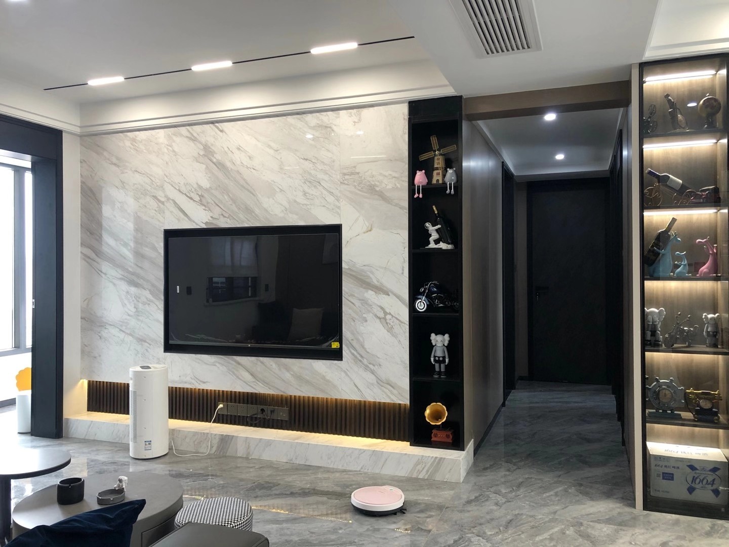 现代设计,内嵌的电视机机位,大理石的背景墙