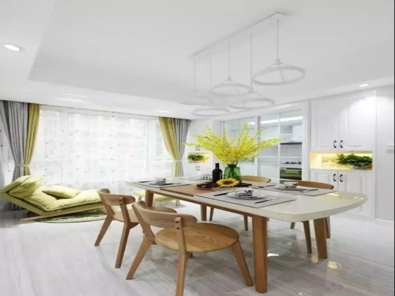 餐厅厨房移门的两边做了两排储物柜,不仅能收纳储物,也更好的起到了装饰作用。特别的是在餐厅旁边的阳台放置了懒人沙发,杨过透过落地窗进入,午后躺一躺惬意得很。拼接餐桌,很有格调与个性!
