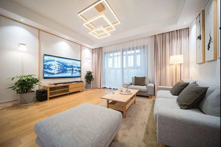 客厅以白色+原木为主色调电视背景墙以木饰条来勾勒出空间的规则性,和空间中其余的线条部分相呼应。沙发后面的清晰明确的线条装饰有非常强的几何感和立体感