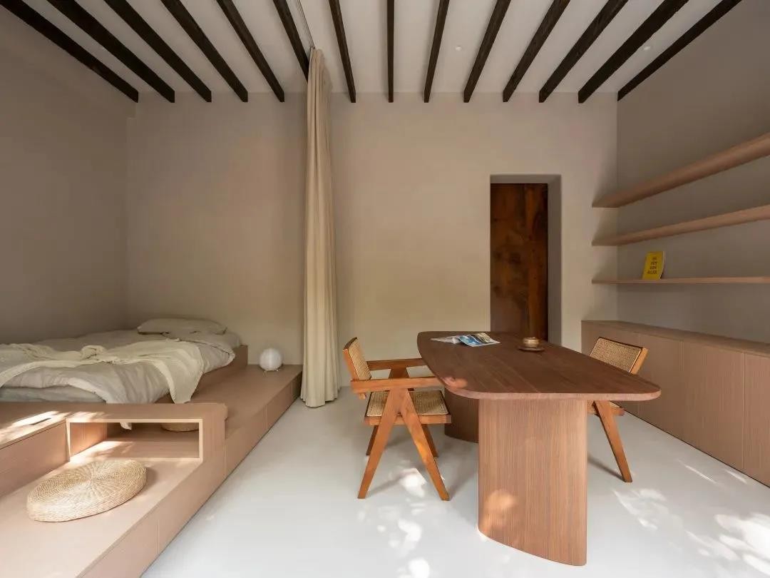 卧室和书房相结合,用一道麻质的窗帘作为隔断,可开可合。