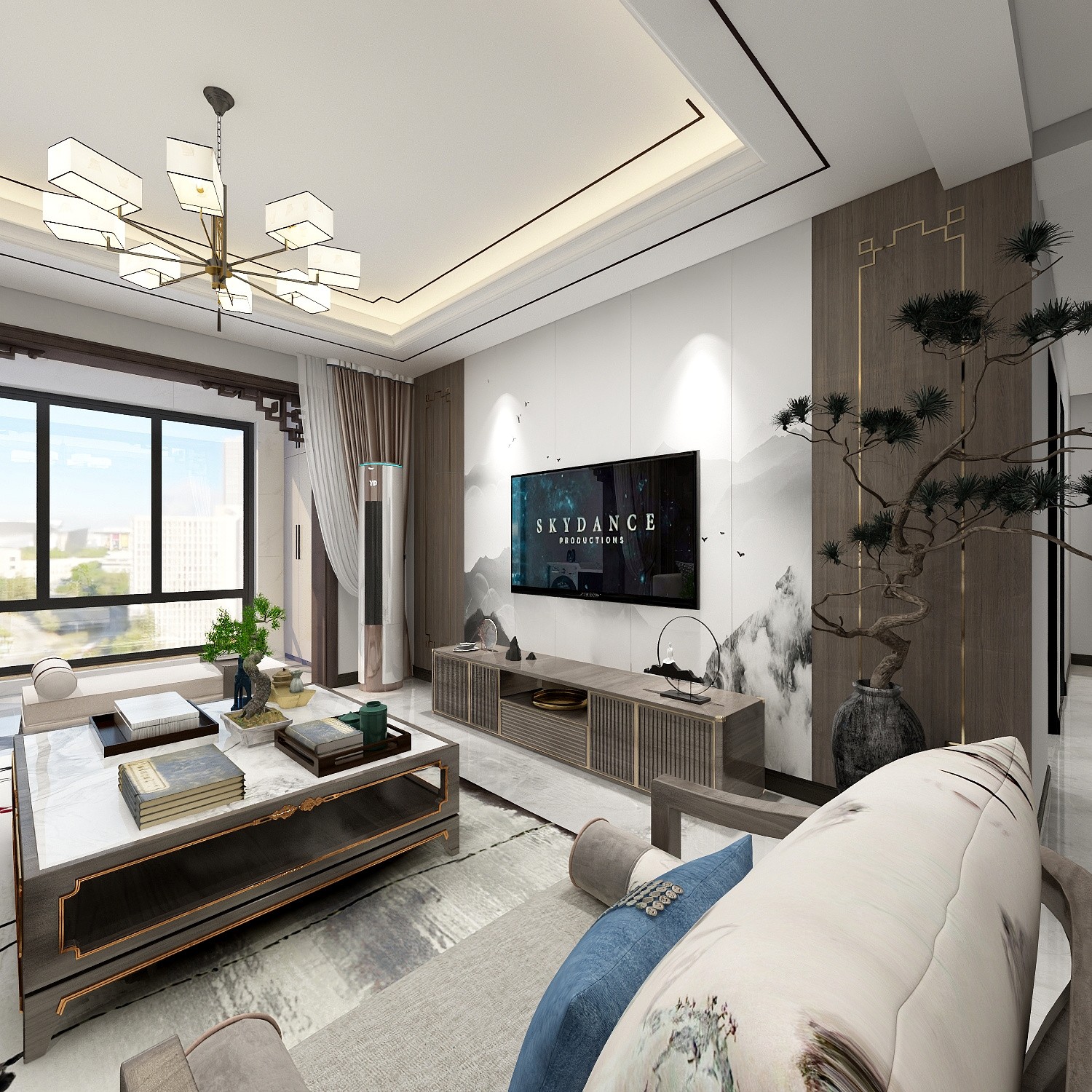 顶面用了黑钛走了中式的线条,沙发背景选了副新中式壁画。