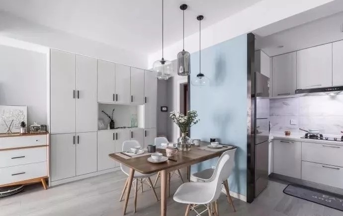 入户处的玄关走廊做了换鞋凳和鞋柜组合式的设计,走过小玄关之后就到了餐厅,蓝色的背景墙搭配原木风的餐桌椅,非常好看。 到顶的鞋柜也作为餐边柜来用,中间处留空方便存放一些杂物和装饰品,白色柜子搭配黑色的门把手,给人一种简洁感。