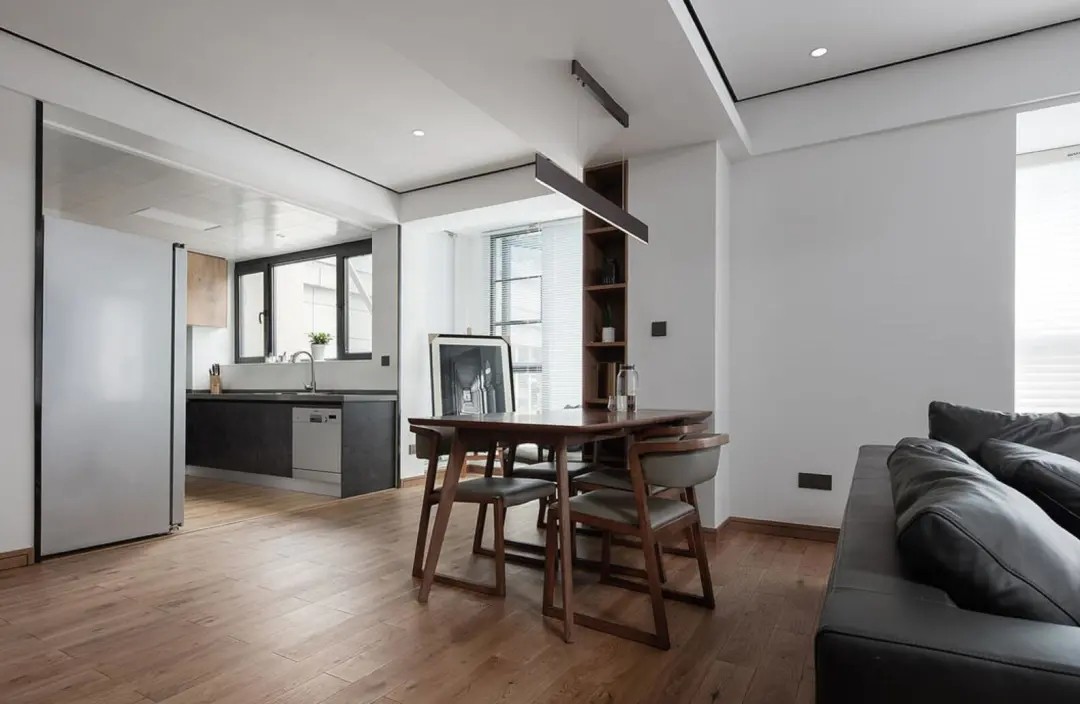 虽说客餐厅是采用一体化来设计的,但为了区分空间,以及让入户有一个缓冲区,还是在进门对面设计了一组隔断柜。这样既让空间有了独立的玄关区,也起到了一点遮挡的作用。 同时,柜体底部做悬空设计,也弱化了柜体的厚重感。当然,该柜子也是用来弥补鞋柜空间的,毕竟在生活中,换季收纳需求是肯定要考虑的。