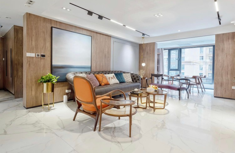 客厅作为重要的公共区域相对独立,胡桃木墙面由玄关延伸至客厅,引导视线深入。沙发背景墙由护墙板和灰蓝色墙面拼接而成