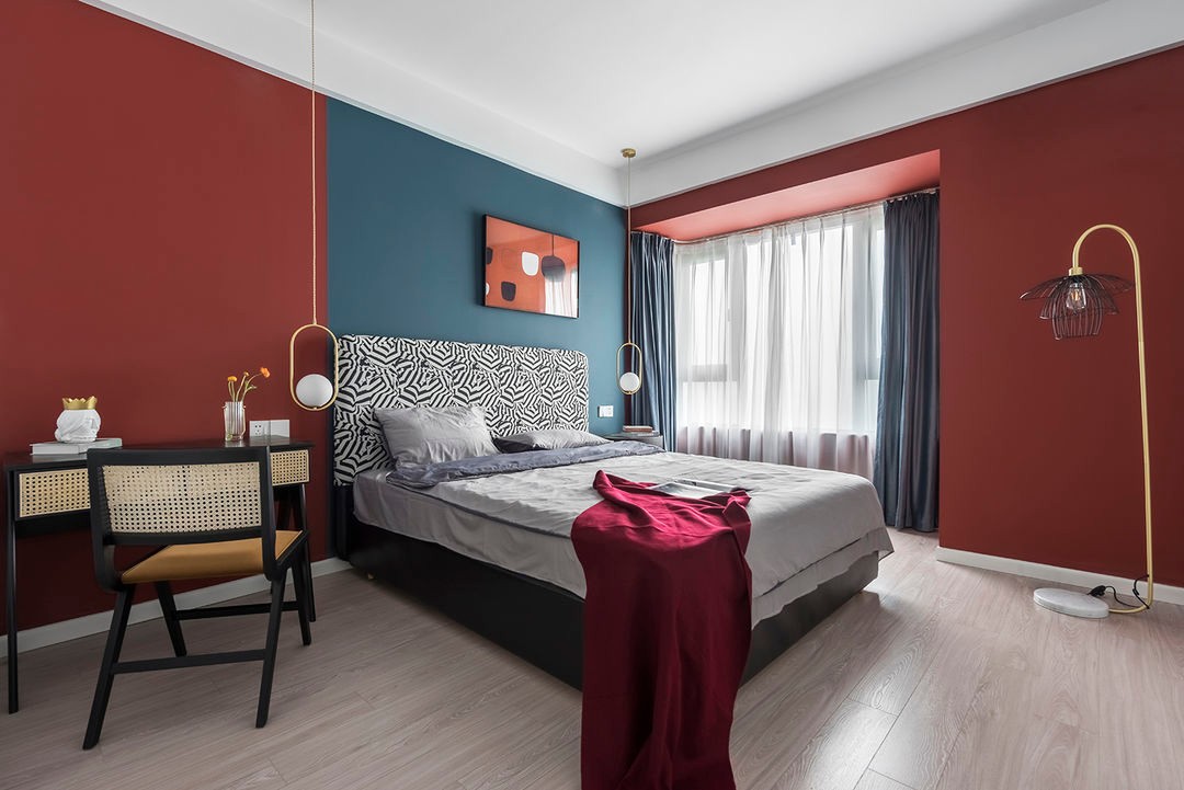 墙面背景选用了暖色系,色调饱和度低,有助于睡眠, 深灰色床靠背做点缀,金属吊灯提高了整个空间的层次感。