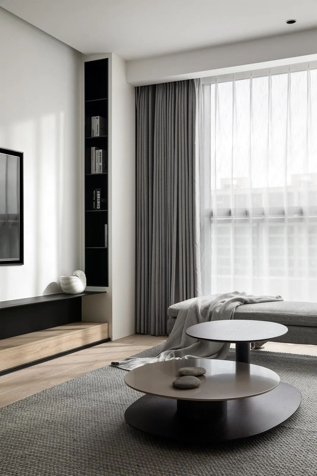 客厅 于简质空间中 点缀诸多细微元素 以灰色亚麻地毯, 质感布艺沙发及深灰窗帘为主色调, 给予静宁、素雅、平和之体验。引入去出,触摸、去感受、去发现,体会生活的美好。
