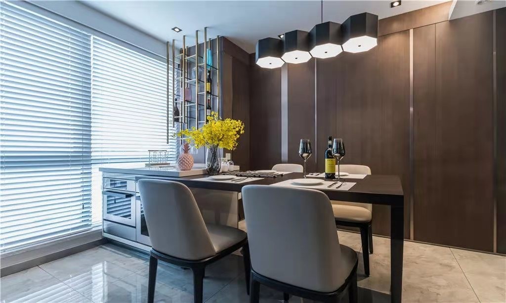 位于房子另一侧的是餐厅空间,用百叶帘来分隔阳光,在餐桌椅的边上也做了酒架的设计,吊灯的款式让人感觉非常有创意。