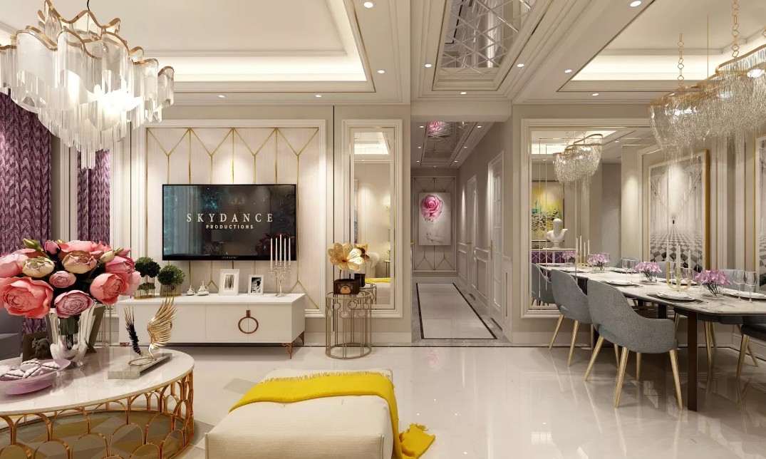 电视背景墙,护墙板点缀装饰线,金线吊顶相呼应
