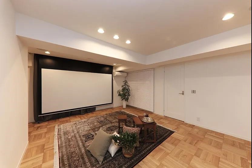 大型家庭影院,配备 120 英寸电动屏幕,安装在客厅中,这是聚会时的必备娱乐事项。