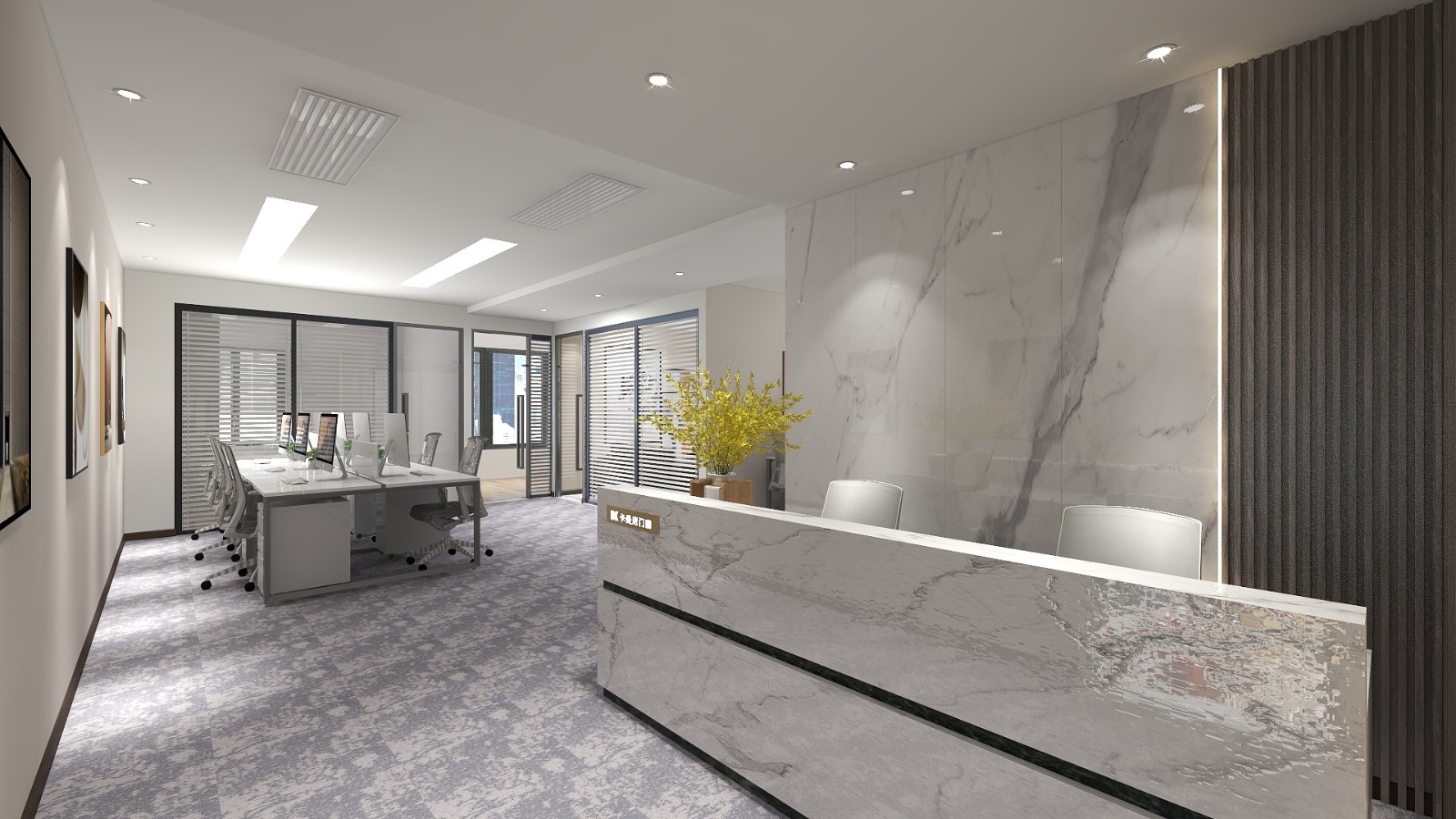 办公区采用白色质感漆搭配亚克力灯片,简单明亮,提高工作效率。