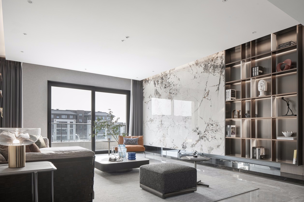 在开阔的叙事空间里,物品也有着自己的适度表达。灰白主色调与蓝、橙色块相应点缀,为淡雅的空间加入几抹跳色;电视柜采用潘多拉星云岩板,由上至下大气铺开而不落地,茶几、沙发和天花墙的悬空与留白也在传递着适度的考量,每一帧都如艺术画般精心着笔。
