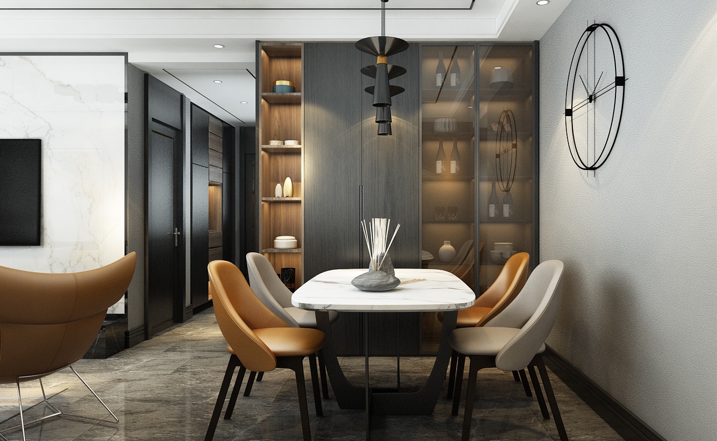 装饰要素:金属材料、玻璃+色彩+线条简洁的家具、简洁大方的装饰造型、时尚的软装饰。