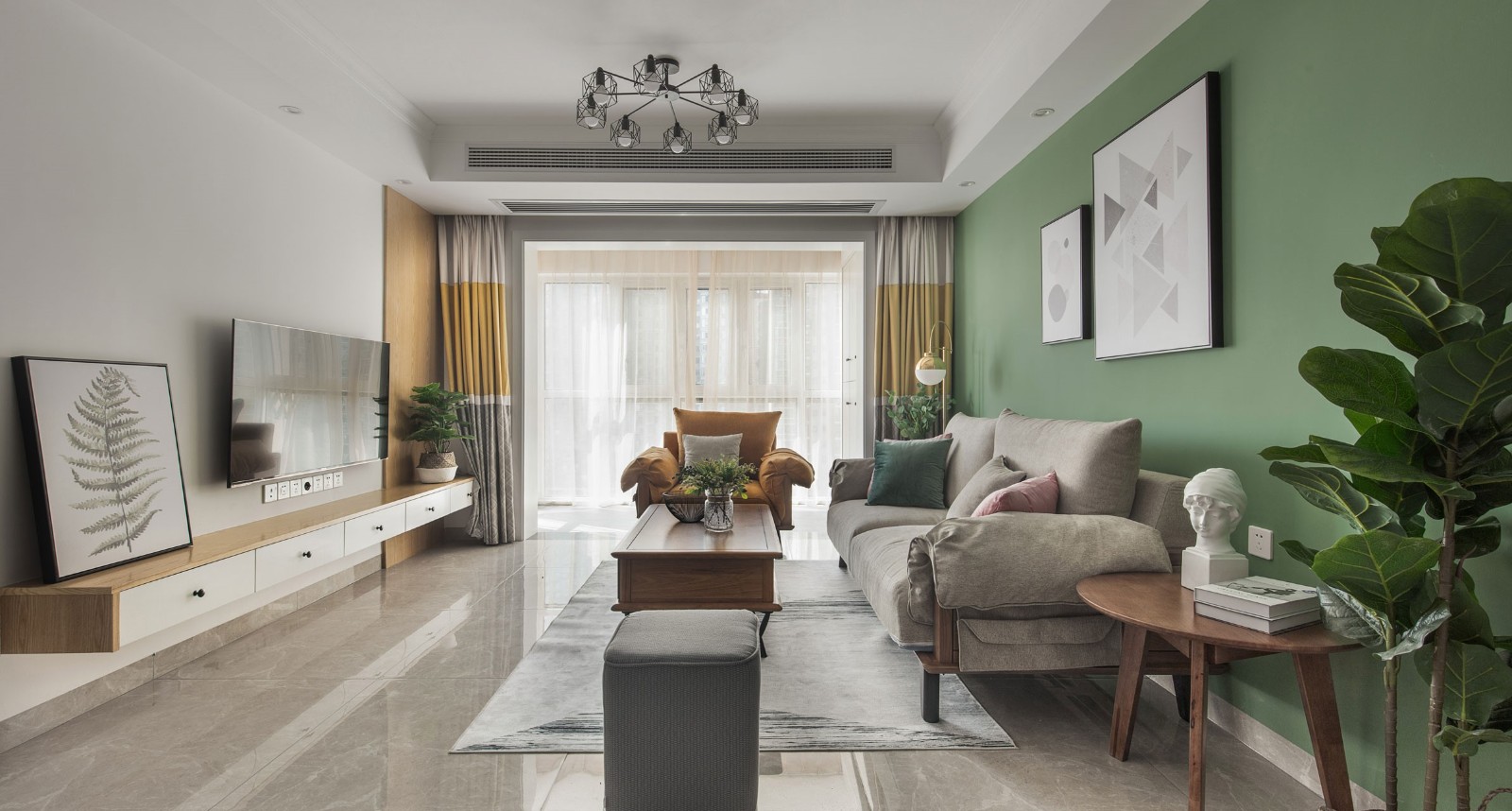 简约的北欧,绿色是客厅的主色调,后期建议业主搭配原木色的家具、金色元素、绿植摆件让视觉更加丰富有层次,整体和谐统一。