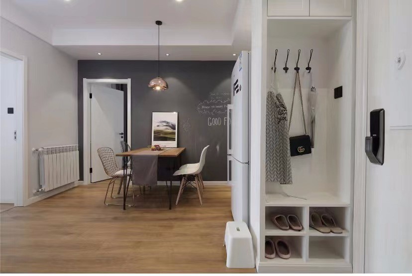 入户的右手边,现场制作了挂衣,换鞋椅及小的鞋柜一体的白漆饰面的柜子