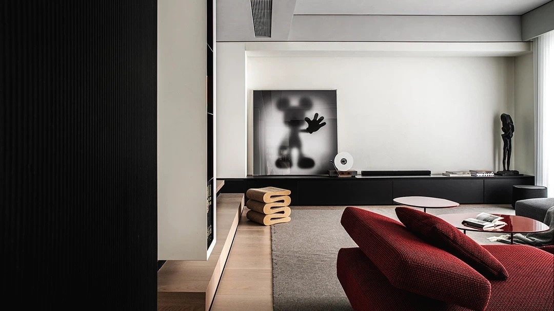 现代风格的展示,设计师运用对比色对空间进行划分,冷暖的对比突出了空间的时尚感