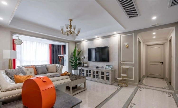 吸睛的亮橘色单品点缀,把生活,晕染成一幅生动的画。看过去电视下方,有一个超级能装且与客厅整体色调互相融合的电视柜。浅灰和方形玻璃的相得益彰,让这个优雅的空间充斥着内在的尊贵,低调的奢华,每一处细节都是感人和温馨。