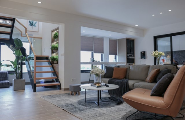 厨房切菜区域在吊柜底部设计了自动感应的灯带,过道有洗墙灯,楼梯有踢脚感应灯,过道设计了线性灯作为通道的装饰,柜子里面也设计了感应灯,整个无主灯的设计让整个空间更为简洁。