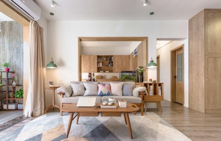 樱桃木搭配浅灰色棉质的沙发,功能性强大的茶几,再配上豆沙绿的小吊灯,既凸显柔和之感又不乏活力气息。