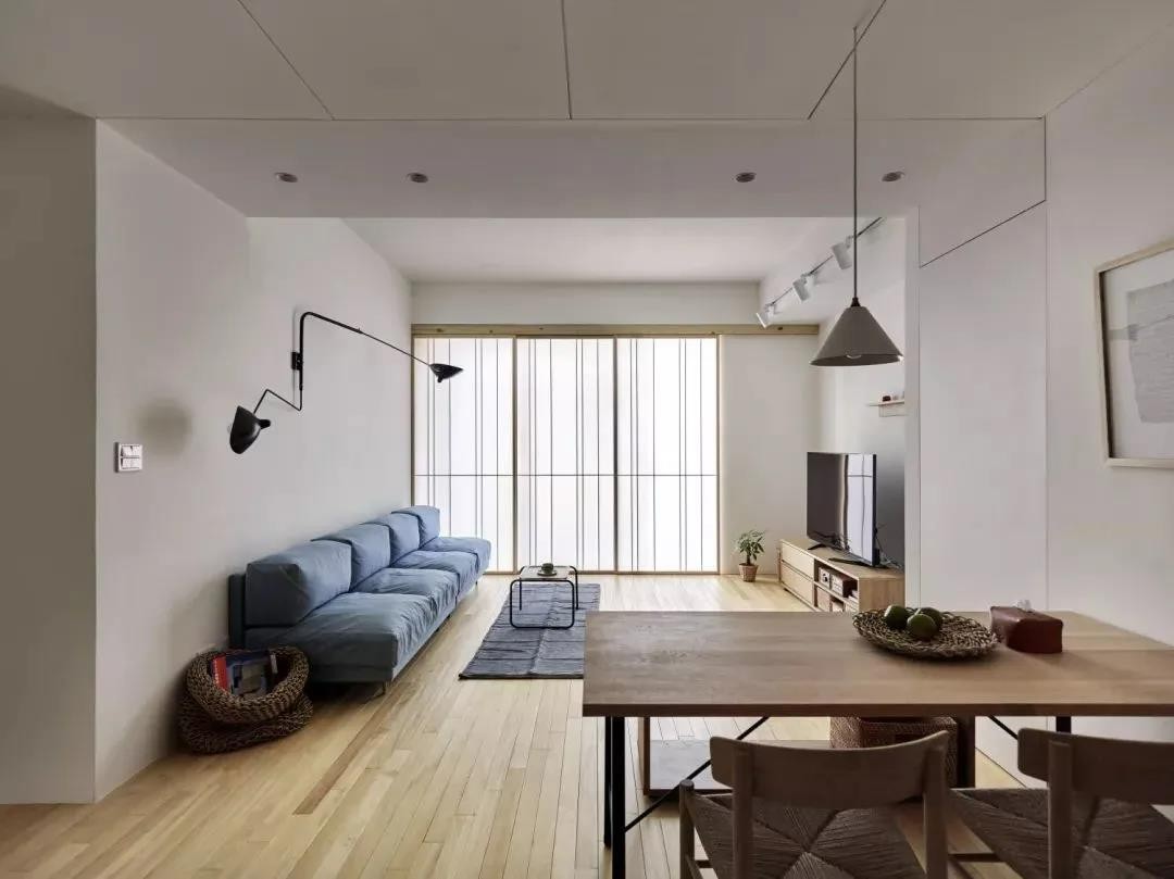 客厅的电视背景墙同样是大面积的留白,只做部分的隔板作为点缀。阳台和客厅之间设计了一个很有日式风感觉的推拉门,感觉门外就是一个庭院。