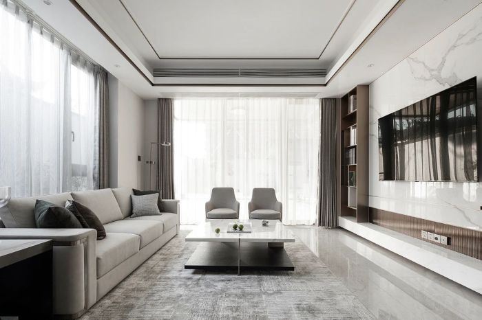 后侧浅木色展示柜述说着屋主的过往与心境。角落处阵列式灯光营造出视觉独立的小型空间, 两张对坐低矮沙发,两杯红酒,言语间便是笑谈人生。
