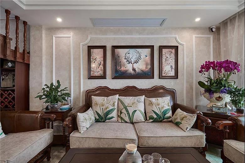 ,整体装修为美式复古,家具多为深色实木材质,软装以浅色为主,深浅搭配。