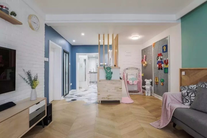 今天屋子的主人,是一个年轻爸爸,从事影视制作行业的他举手投足间带着文艺的气息,性格随和,还带着一些没有泯灭掉的童趣和童真,每每提到自己的小家,这个年轻人的眼神里总是闪烁着掩饰不住的笑意与幸福。一、门厅处通过更改卧室门位置,并把墙体向内推进,这样设计增加了入户玄关。 二、厨房为开敞式设计,增强了空间南北通透性和痛风性。 三、重新规划卫浴空间,让户型拥有干湿分区。