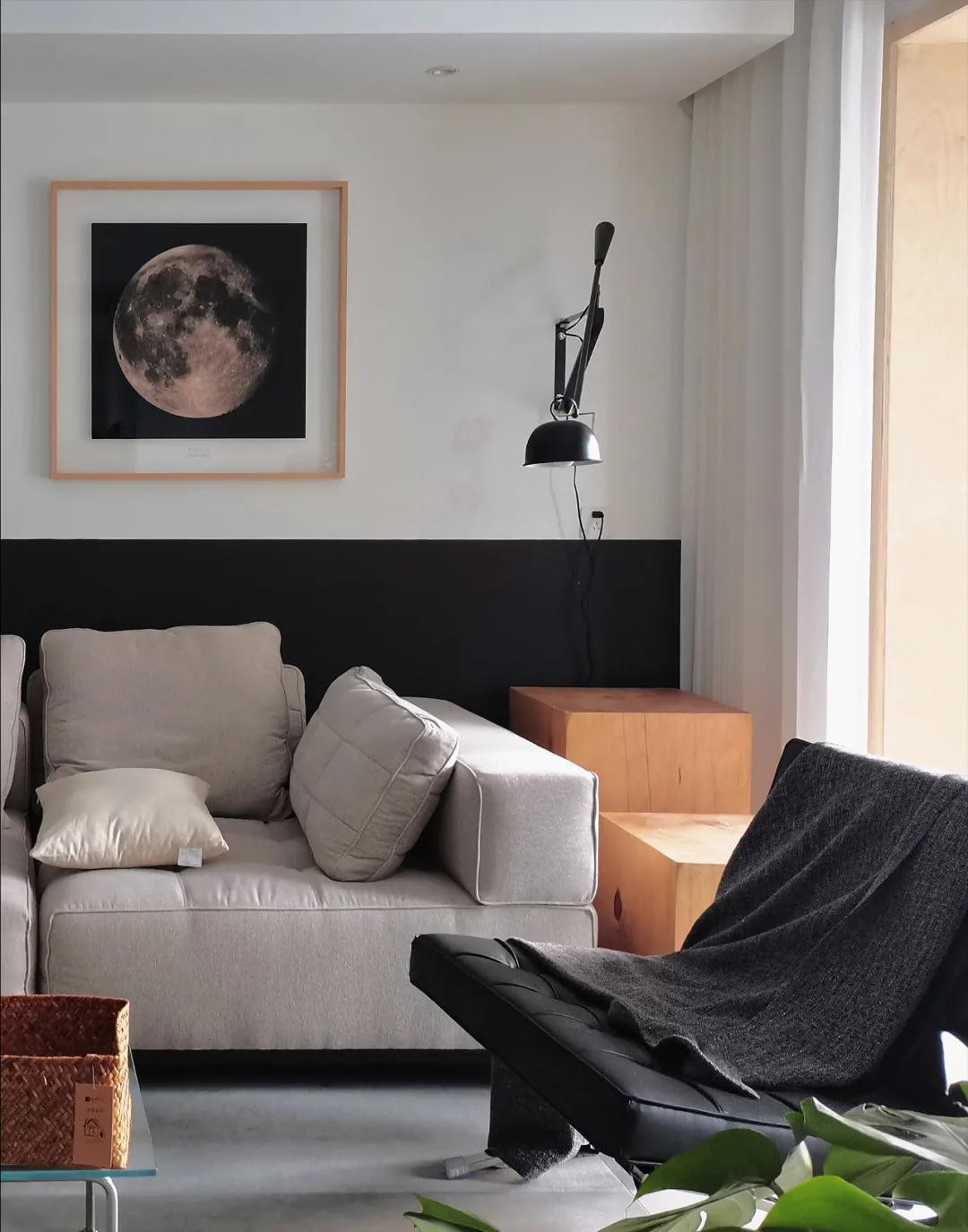 客厅在材质色彩上,以黑白灰和原木为整个空间的基调,沙发背景墙进行了分色设计,黑白色块的碰撞点缀木色进行中和,自然简约。