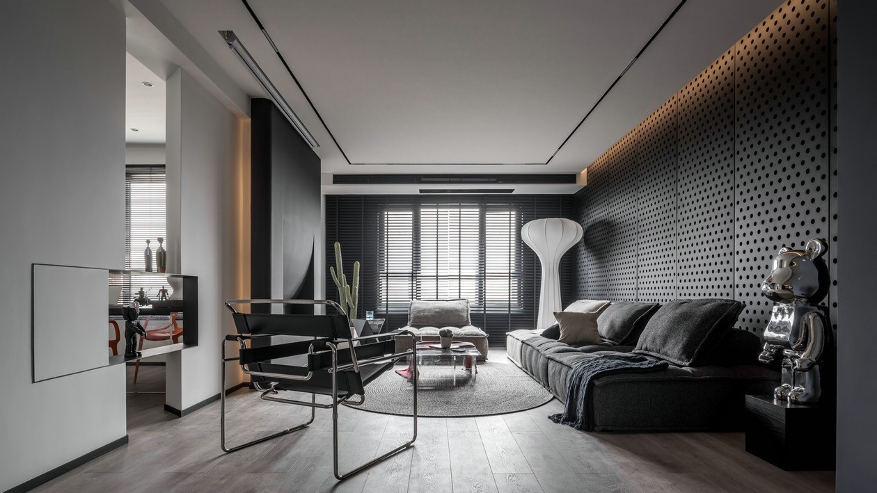 南北通透的布局、白色的石膏板吊顶、半哑光的黑色乳胶漆墙面,设计师恰当地掌握了灯光与色彩的关系,赋予了沉闷黑色一丝生气。