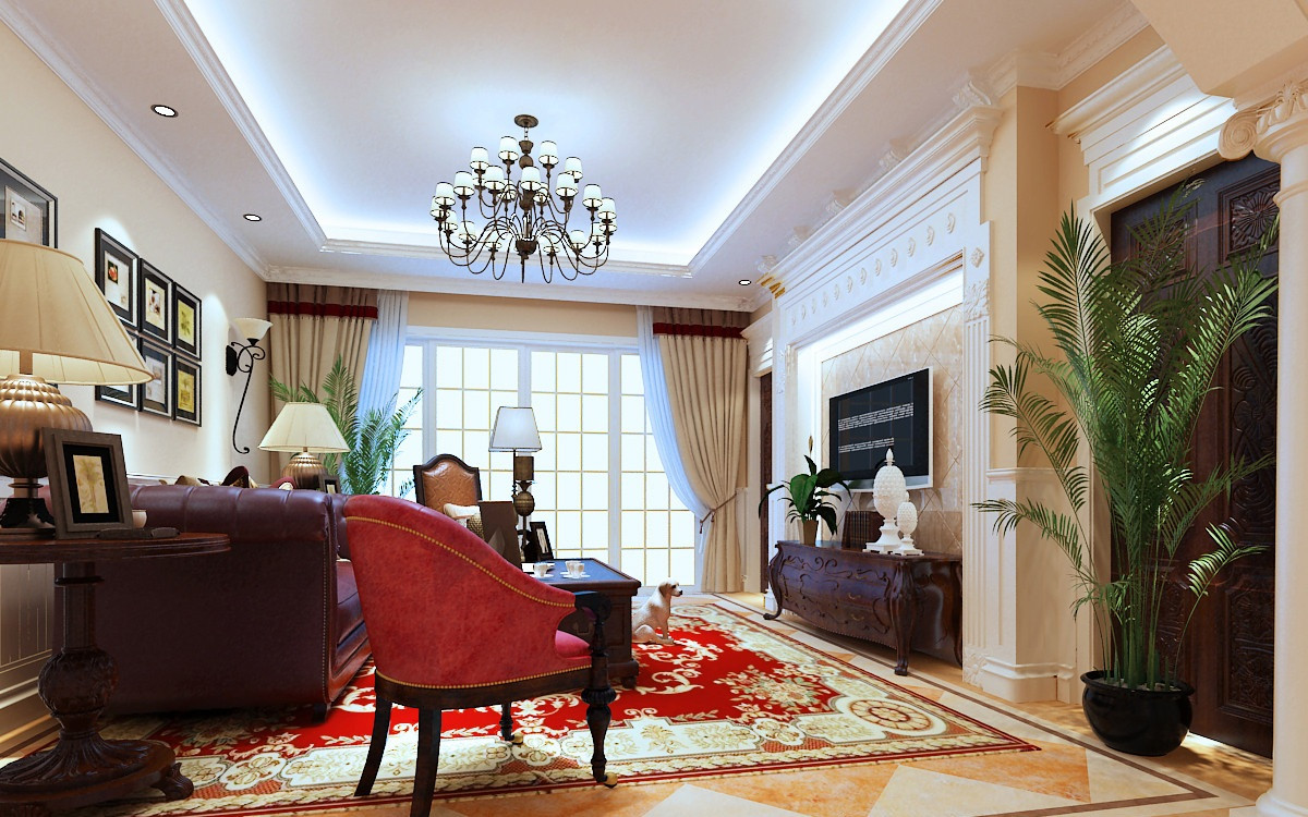 客厅背景墙采用欧式壁炉造型,中间用微晶石铺就,增强背景效果,顶面回字形叠级吊顶,辅以灯带点缀。