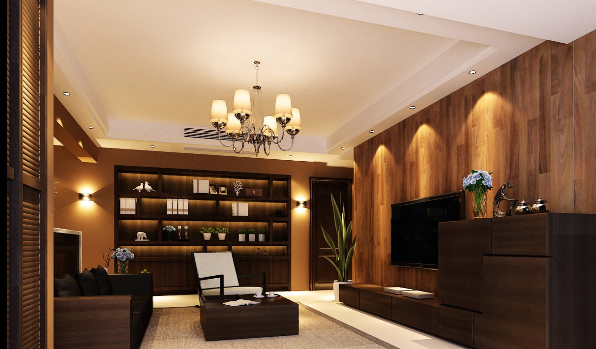 此案例风格为港式混搭,客厅采用东南亚原木板上墙。