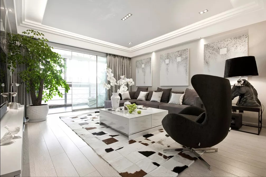 一张深褐色的L型沙发,搭配一张单人蛋型沙发椅,合理又赋有变化。 整个室内空间在色彩上比较素净,偏好白色。而深褐色沙发能丰富空间的层次,不至于过于单调。