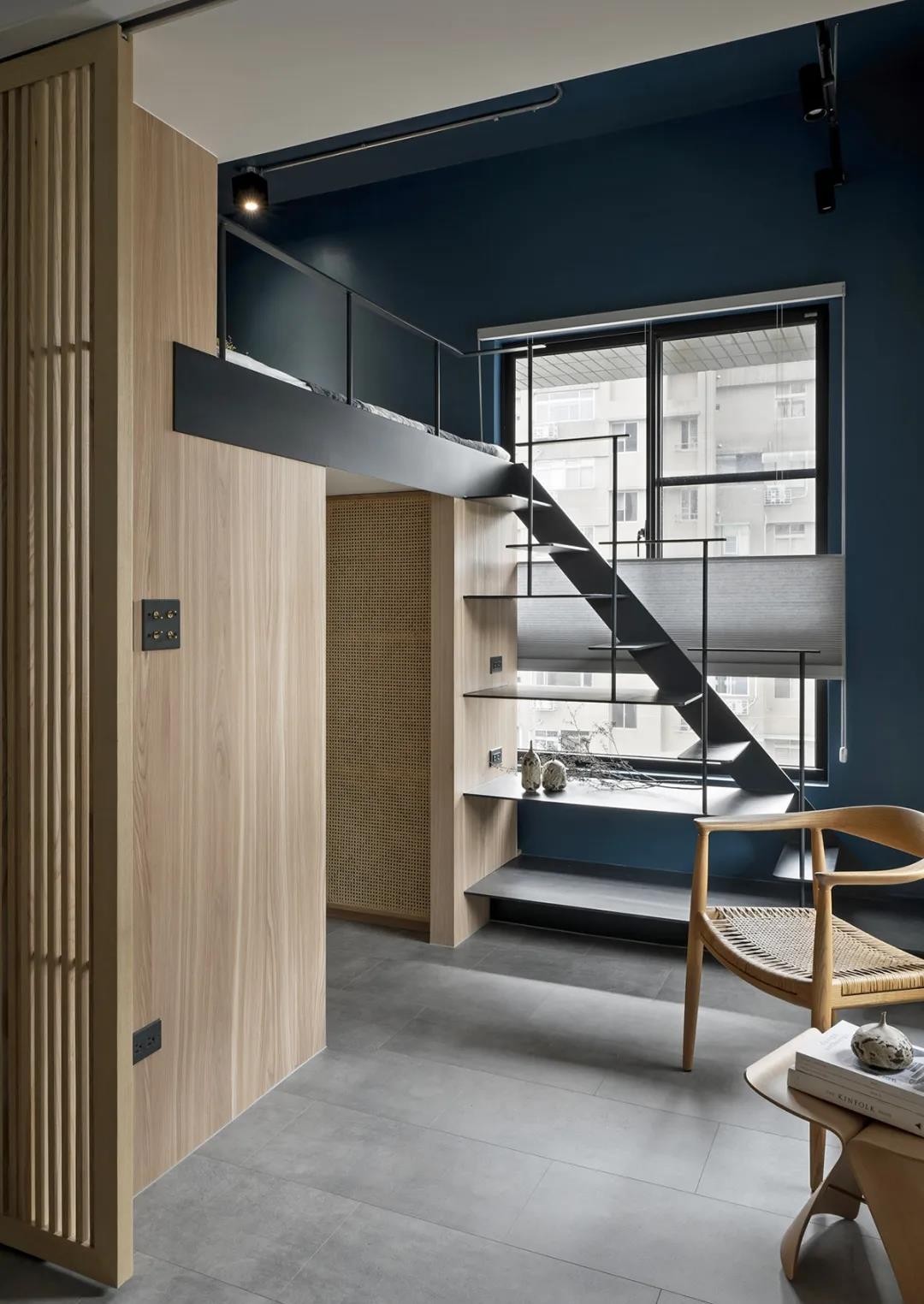 另一端则导入日本鸟居意象 透过倒圆角铁件构成逐层攀升的楼梯扶手 并且发挥踏阶的可塑性变化 梳理出搁物的收纳平台 邀请层层生活感景致蔓延入家