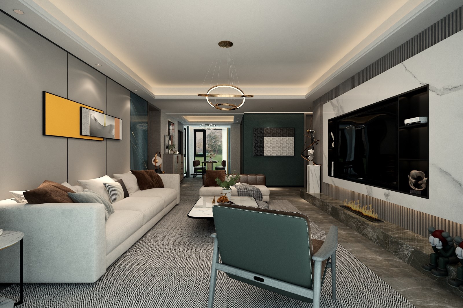客厅整体以灰白为主,采用孔雀蓝进行调色,整体软装搭配简约而不简单。