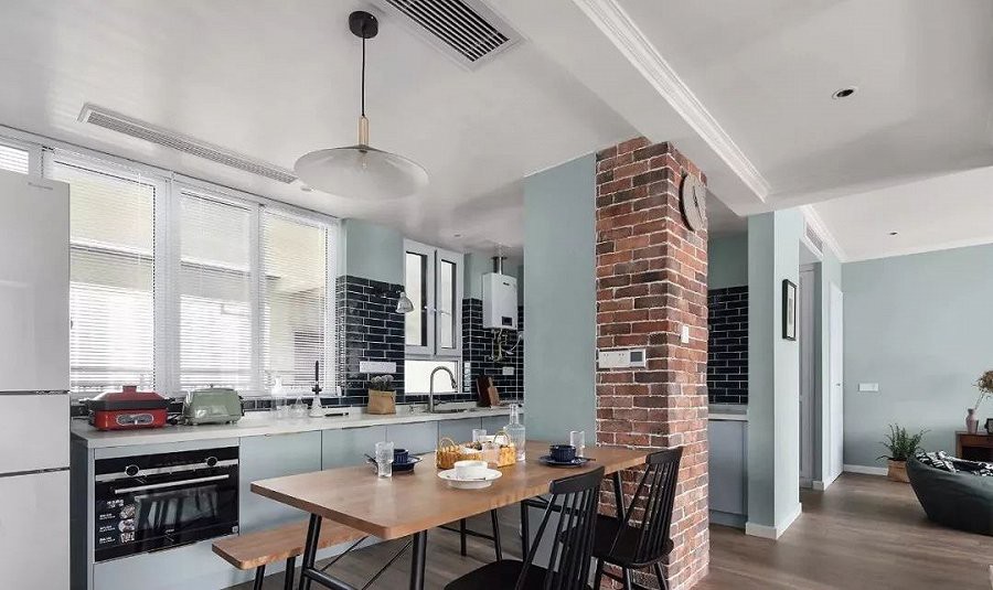 烟道用红砖墙装饰成柱子,侧边烟管则隐藏进储物柜里面。