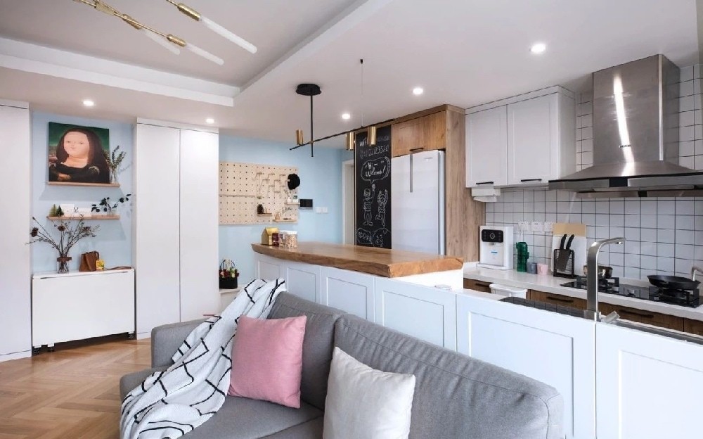 公共空间以开放式的布局让功能区域紧密相连,也创造出更多的可活动空间,客餐厅与厨房一体的开放式空间,使得有限面积里的视觉观感达到***化,各个空间之间取得相对完整、平衡、稳定的结构,客厅蓝色墙漆,地面铺的木质鱼骨形地板,不归整地毯,灰色布艺沙发,沙发边上的粉色小圆桌替代传统茶几,木质电视柜,细高脚家具让空间看起来更加立体通透,线条状不规则吊灯可以照亮又可以当装饰。