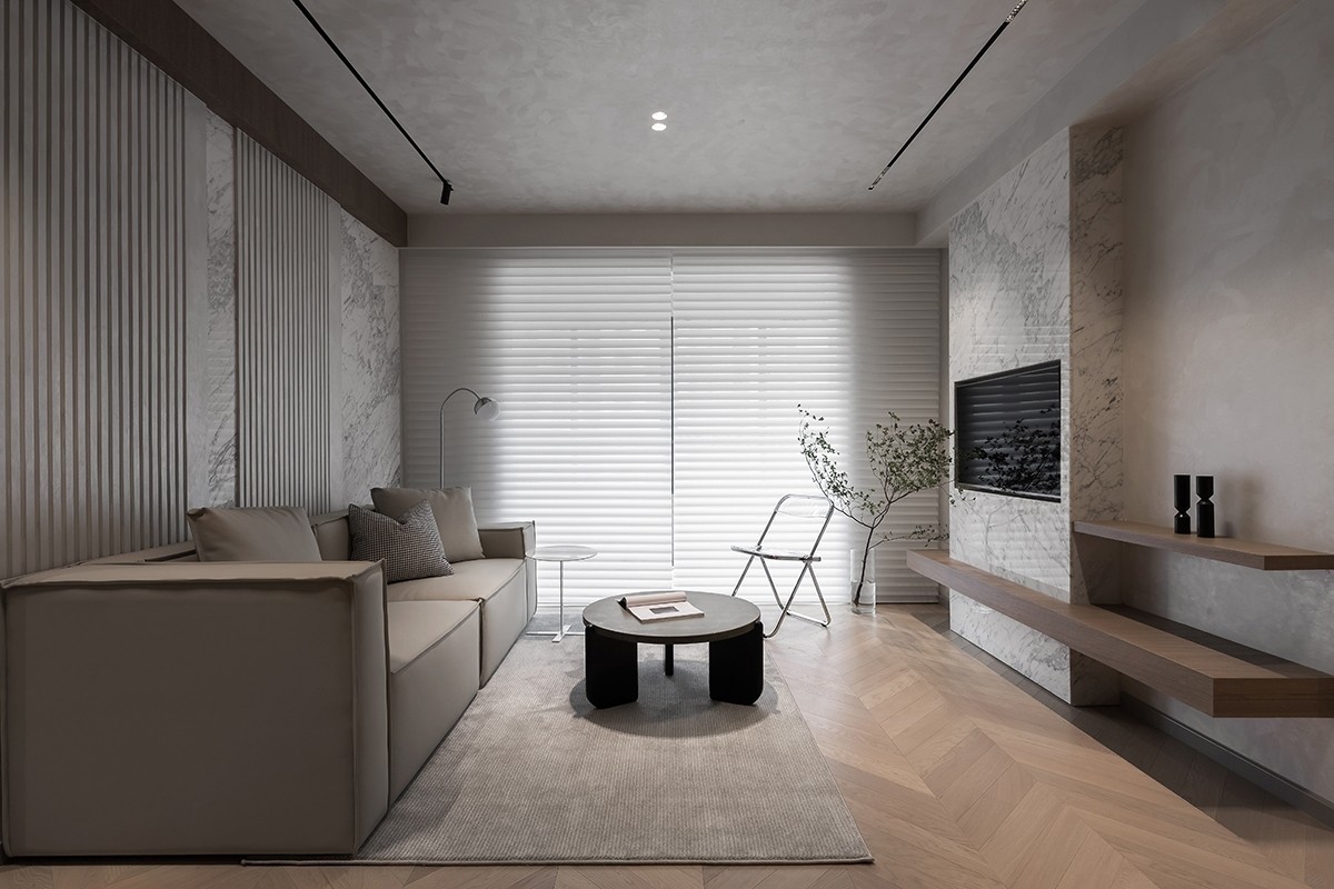 客厅不算大,但足够整洁纯净。木质的层板,温润的石材,顶面采用艺术漆材质处理,搭配舒适柔软的皮质沙发,木质的鱼骨地板,让空间格外的舒适,没有任何的压抑,给人非常放松的感觉。