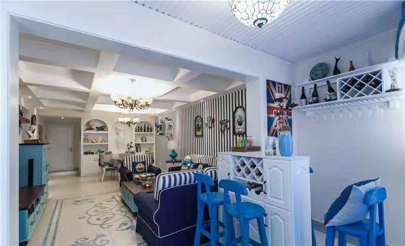 蓝色格子的餐桌和坐垫搭配以蓝色相间的墙纸为背景的餐厅带出地中海的清新格调。