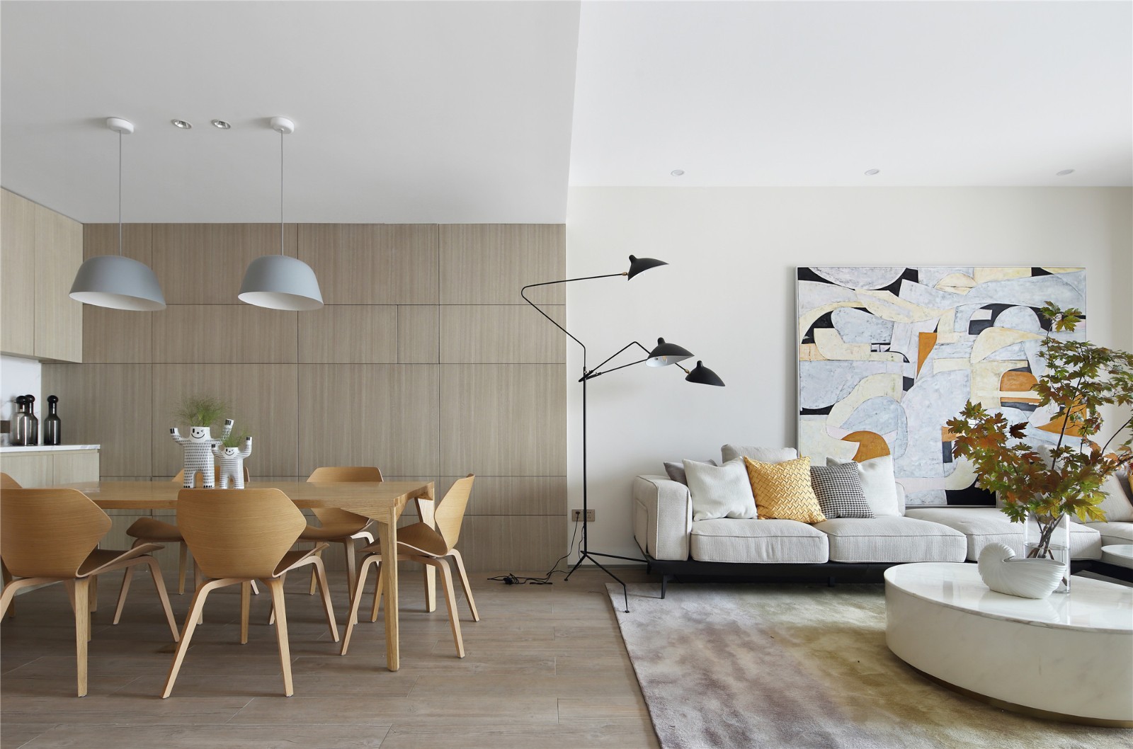 玄关处,几何状白色摆件与自由生长的花枝构成了一幅生动的画面。木梯成为了行动的衣架,生活为创意增添了灵感。进入家门,就将开启一个温暖而快乐的居家世界。