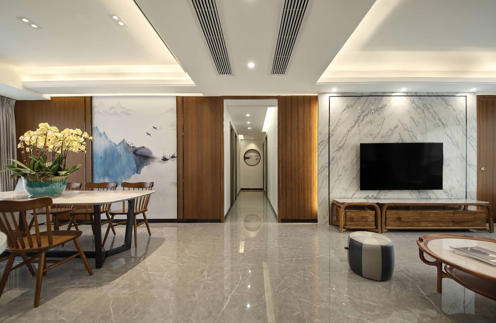 客厅为开放式,与餐厅和西厨无缝衔接,在色调和物料的重组中把中式韵味赋予现代气息。于简约中,体会中庸的和谐,在淡泊中感悟自然和力量。