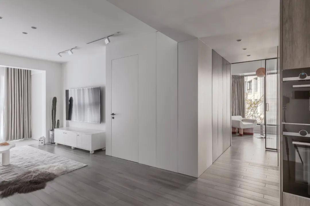 过道与客厅之间的在立面通过柜体得到延展,从入户衍生的顶面与过道形成一个整体,窄边框到顶的玻璃移门让过道视野豁然开阔。透过柔软的家具与窗帘,可见落地异形飘窗。