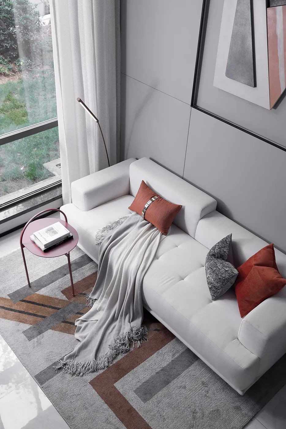 在低饱和度灰调的铺叙下,设计采取不同层次的橘色作为点缀,勾勒着简约灵动的空间氛围。墙面的抽象拼贴挂画与几何构图的地毯形成对映,搭配极具艺术格调的装饰小品、材质柔软的布艺沙发、不规则大理石凳几,空间呈现出和谐统一的当代美学秩序。