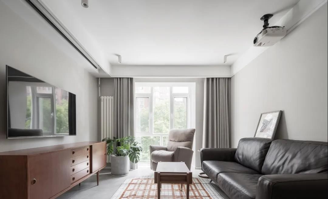 客厅宽敞明亮,整体以黑白灰为基调,无主灯设计,电视墙顶面隐藏投影幕布,窗帘与墙色选择明暗程度不同的灰,更具层次感