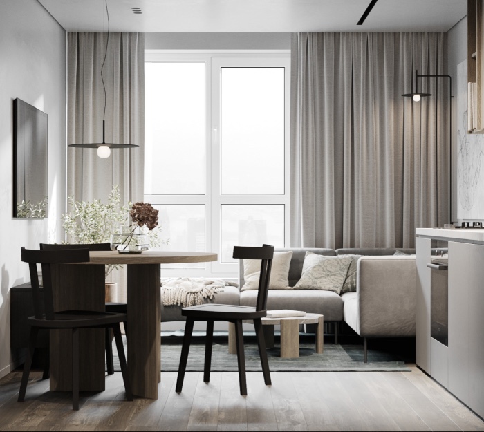 客厅与餐厨空间合二为一 矩形采光窗为室内引进自然光线 淡雅整洁的布局令人身心放松