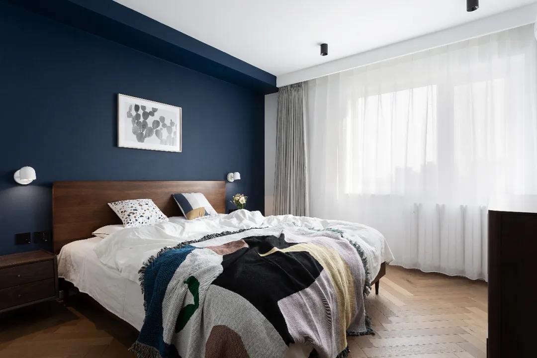主卧同样是深色的墙纸,为了让气氛不那么沉闷,使用透明窗帘,增加卧室呼吸感。