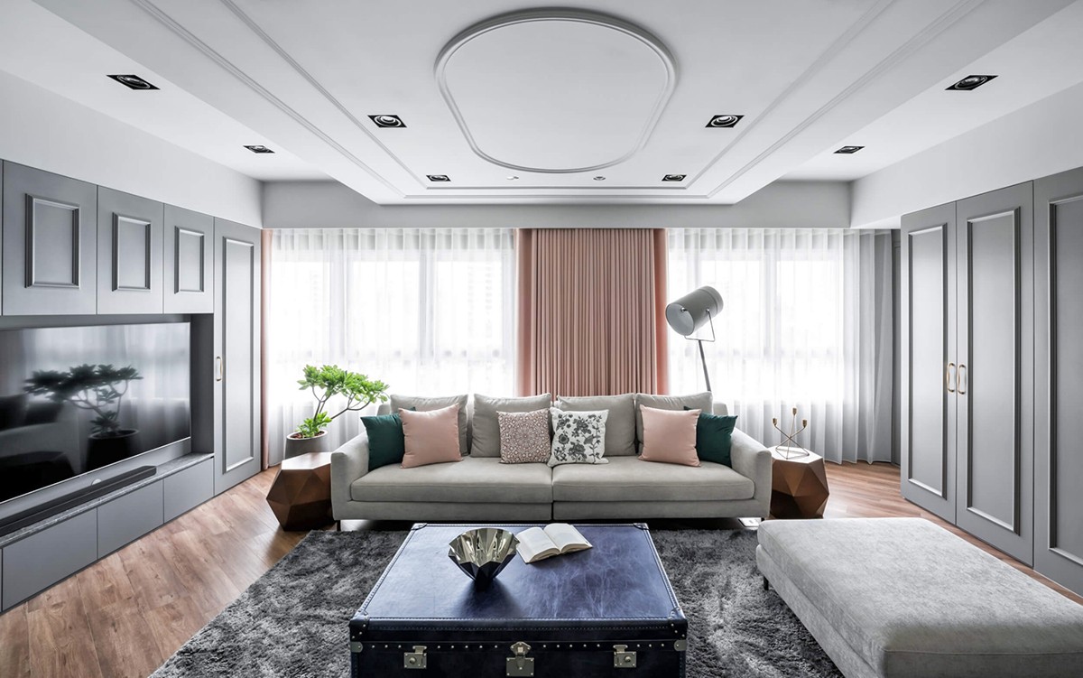 同步根据女主人爱好,以珊瑚粉布帘搭衬浅米灰沙发,调和出温甜不腻的生活气息
