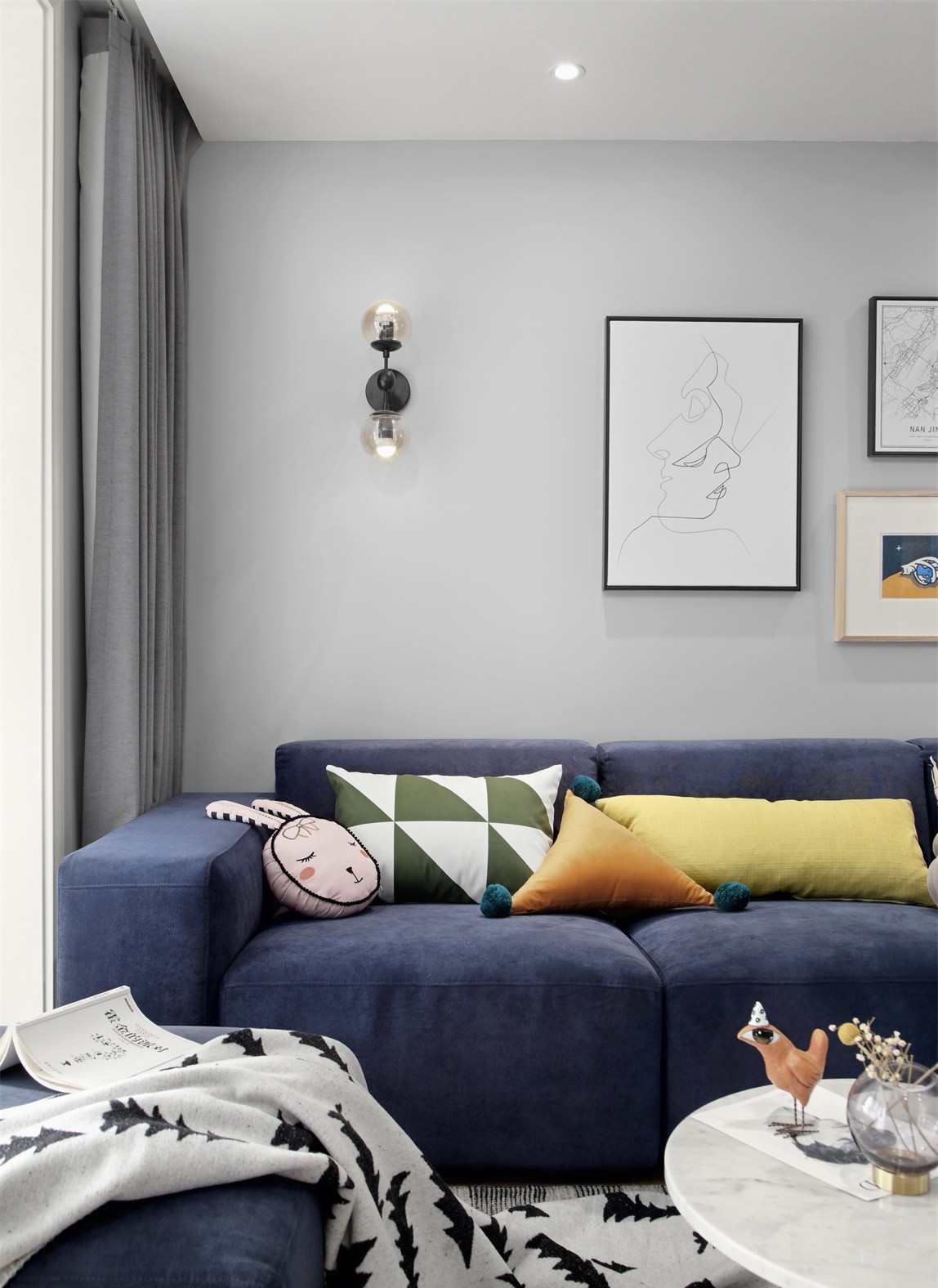 客厅的窗帘比背景墙颜色深了一点,是为了让空间更加有层次感、设计感,而且深灰颜色的窗帘耐脏还简约。