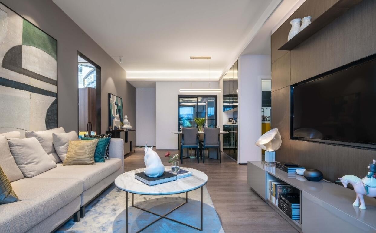 客厅配色沉稳又不失悦动,设计中满含着对家和生活的热爱,开放式空间布局,将简约与奢华完美结合。