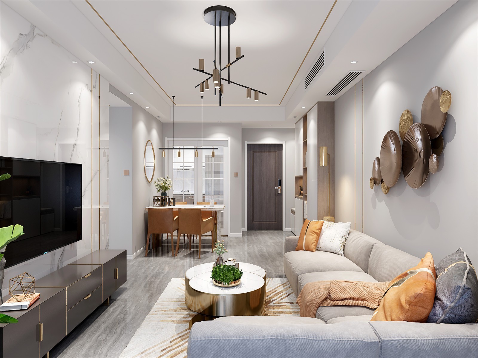 电视墙穿插金色线条,造型独特,顶面也采用金属线条设计,增加了空间的层次感。